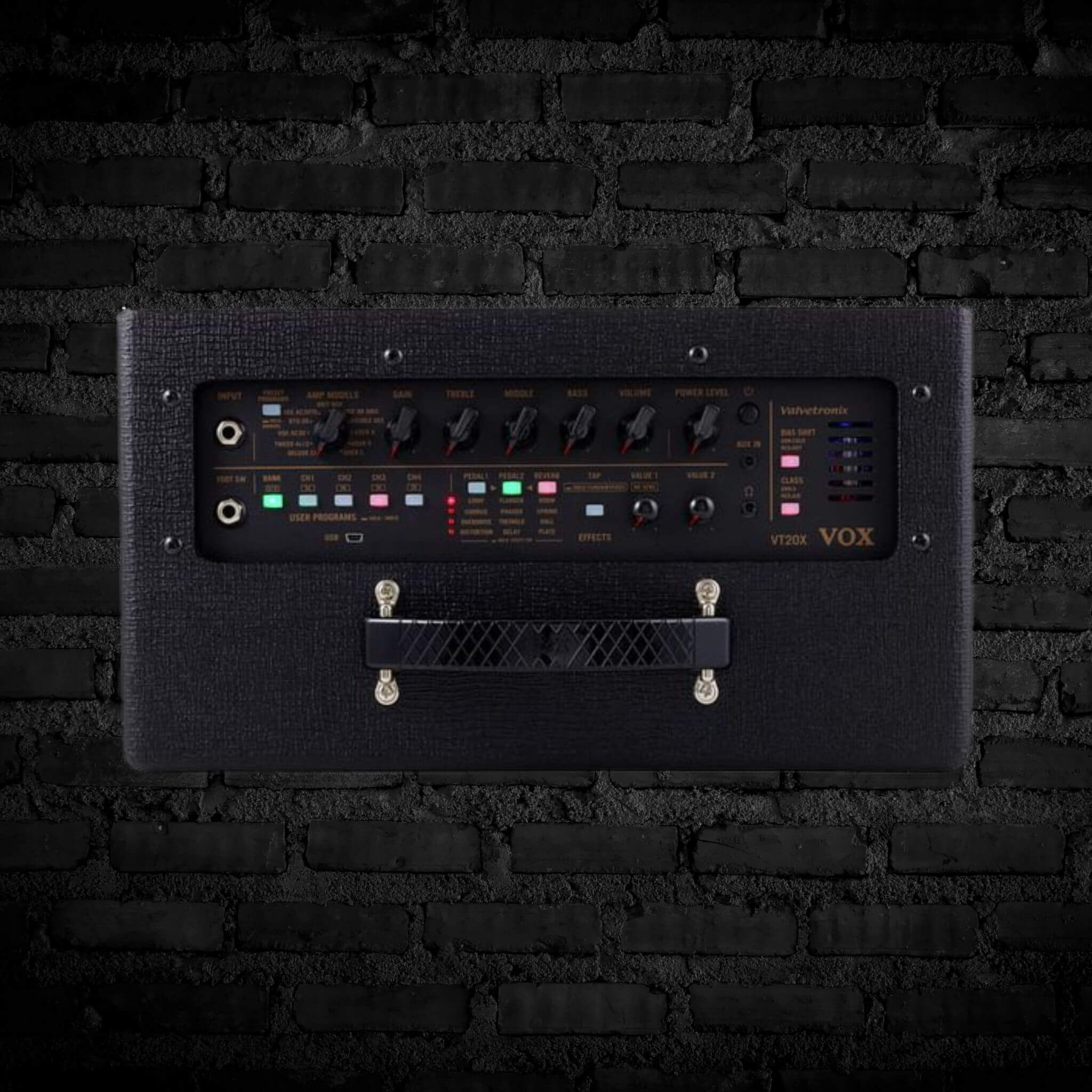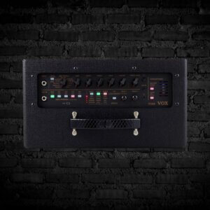 The Vox VT20X modeling guitar combo amplifier employs sophisticated digital technology, along with a unique analog circuit, to bring you authentic tube power amp performance. Vox analyzed actual amp components and circuits when they designed the VT20X, so each of its 11 amplifier models sounds incredibly realistic. A multi-stage Valvetronix tube preamp incorporates true tube circuitry, so you feel the subtle nuances that you’d expect from a tube guitar amp. A tightly sealed cabinet and expertly designed bass-reflex structure, along with 13 classic stompbox effects, ensure that the Vox VT20X modeling guitar combo amplifier delivers an unbelievably powerful tone that far exceeds its modest size.